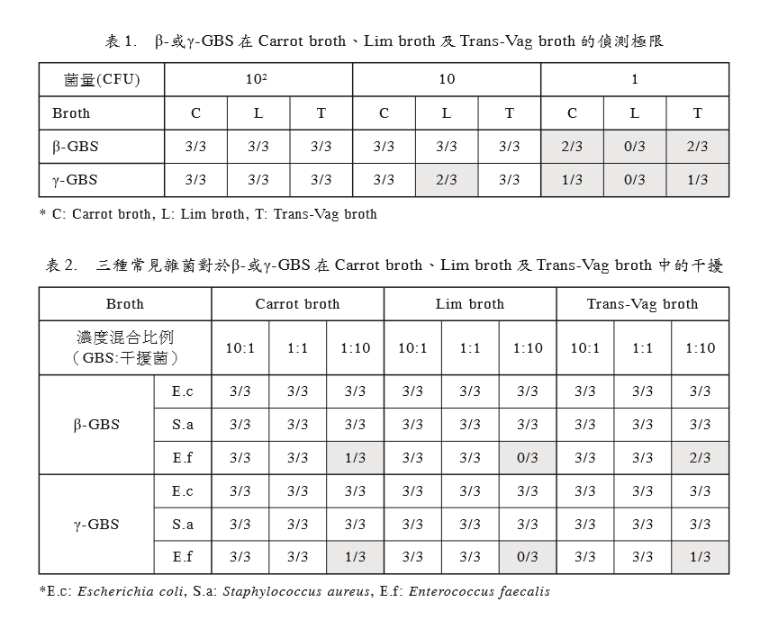 DetectTM會(huì)誘導(dǎo) 溶血型GBS呈現(xiàn) 溶血 型,將可提高 溶血型 GBS 偵測(cè)的靈敏度與 分離率[14-15]。 本研究比較目前GBS檢測(cè)常用的三種增 菌培養(yǎng)液(Carrot broth, Lim broth 及 TransVag broth)的效能,除了測(cè)試此三種增增菌培 養(yǎng)液的偵測(cè)極限,也與三種常見(jiàn)產(chǎn)道棲息菌 混合接種,以了解GBS在偵測(cè)中可能受到的 干擾。